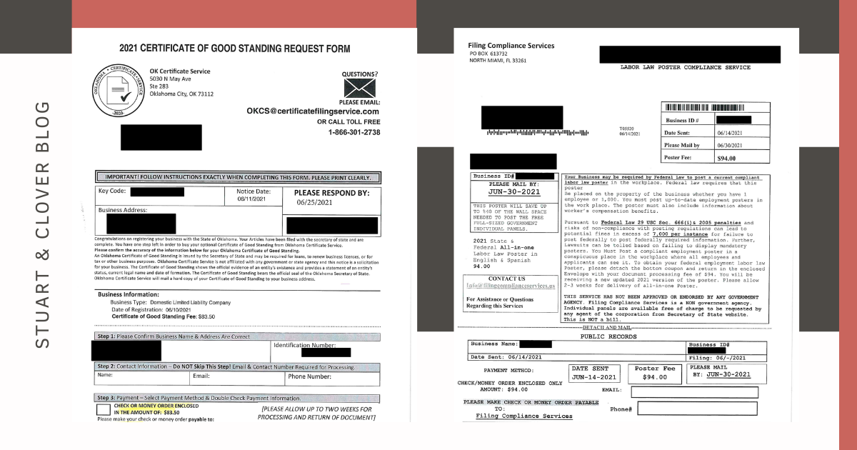 Knowing that business owners are often without full knowledge of what is legally required, certain companies will target newly formed businesses in an attempt to obtain payment for certain services. These companies will offer to provide certificates of good standing, posters describing labor and employment laws, or certificates showing Employment Identification Numbers. While it is true that some of these services are necessary for some businesses, it is heavily dependent on the circumstances of each individual business. Further, these companies charge exorbitant fees, fully hoping the business owner is unaware of the reasonable cost associated with these items. We have included some examples of these companies’ mailings below. Click here or the image below to download.